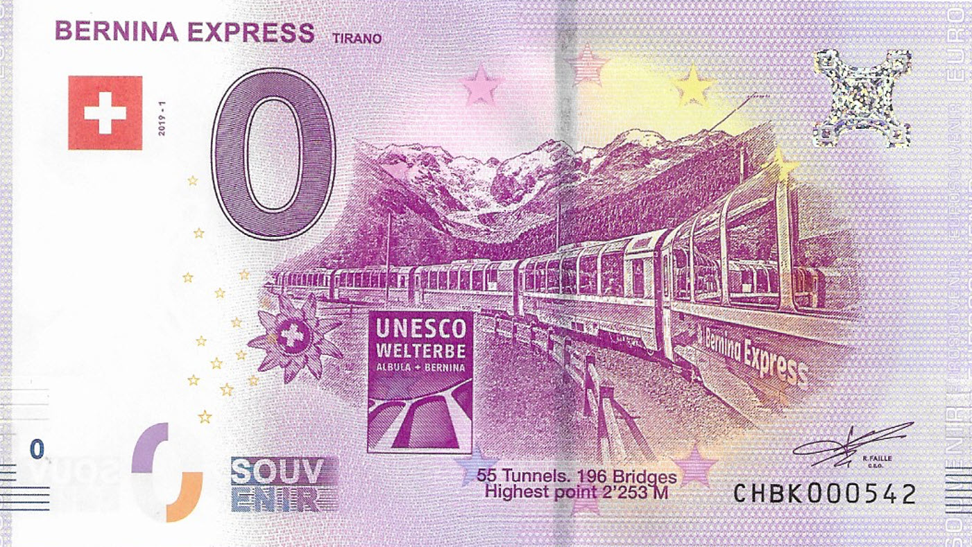 This is the Bernina Express - Tirano Swiss 0 Souvenir Banknote. The Bernina Express is a Panorama Express train connecting Chur to Tirano in Italy by crossing the Swiss Engadin Alps. For most of its journey, the train also runs along the World Heritage Site known as the Rhaetian Railway in the Albula / Bernina Landscapes. The train is operated by the Rhaetian Railway company for the purpose of sightseeing. It takes the form of an enhanced regional service between Tirano and Chur: panoramic coaches with enlarged windows and multi-lingual (English, Chinese, French, German, Italian, and Japanese) audio guide on board.