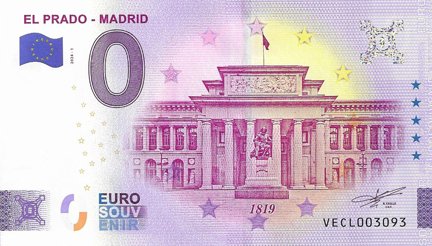 The El Prado - Madrid 0 Euro Note is a 0 Euro Note dedicated to the the Museo del Prado, officially known as Museo Nacional del Prado, which is the main Spanish national art museum, located in central Madrid. It houses collections of European art, dating from the 12th century to the early 20th century, based on the former Spanish royal collection, and the single best collection of Spanish art. Founded as a museum of paintings and sculpture in 1819, it also contains important collections of other types of works. The numerous works by Francisco Goya, the single most extensively represented artist, as well as by Hieronymus Bosch, El Greco, Peter Paul Rubens, Titian, and Diego Velázquez, are some of the highlights of the collection. Velázquez and his keen eye and sensibility were also responsible for bringing much of the museum's fine collection of Italian masters to Spain, now one of the largest outside of Italy. Read more