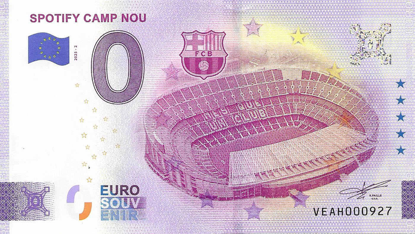 The Spotify Camp Nou 0 Euro Note is a 0 Euro Note dedicated to Camp Nou, meaning New Field, often referred to in English as the Nou Camp, currently known as Spotify Camp Nou (for sponsorship reasons), which is a stadium in Barcelona and the home of La Liga club Barcelona since its opening in 1957. It is currently undergoing renovation, and with a planned increased seating capacity of 105,000, it will be the stadium with the largest capacity in Spain and Europe, and the second largest football stadium in the world. It has hosted two European Cup/Champions League finals in 1989 and 1999, two European Cup Winners' Cup finals, four Inter-Cities Fairs Cup final games, five UEFA Super Cup games, four Copa del Rey finals, two Copa de la Liga finals, and twenty-one Supercopa de España finals. It also hosted five matches in the 1982 FIFA World Cup (including the opening game), half of the four matches at the 1964 European Nations' Cup, and the football tournament's final at the 1992 Summer Olympics. Renovation of the stadium commenced after the end of the 2022–2023 season. Final completion of all renovations is scheduled for June 2026, although the club may return before that date. During the renovation, Estadi Olímpic Lluís Companys is serving as Barcelona's home ground. Read more