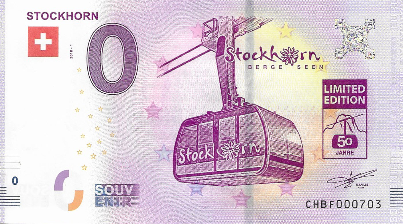 This is the Stockhorn Swiss 0 Souvenir Banknote. The Stockhorn is a mountain of the Bernese Alps, overlooking the region of Lake Thun in the Bernese Oberland. It is located north of the town of Erlenbach im Simmental. The Stockhorn is 2,190 m (7,190 ft) high and is accessible via cable car from Erlenbach. The Stockhorn Swiss 0 Souvenir Banknote was specifically made for the Stockhorn cable car and its 50th anniversary. At Stockhorn, you can enjoy great hiking trails in a wonderful mountain scenery, as well as fishing in mountain lakes.